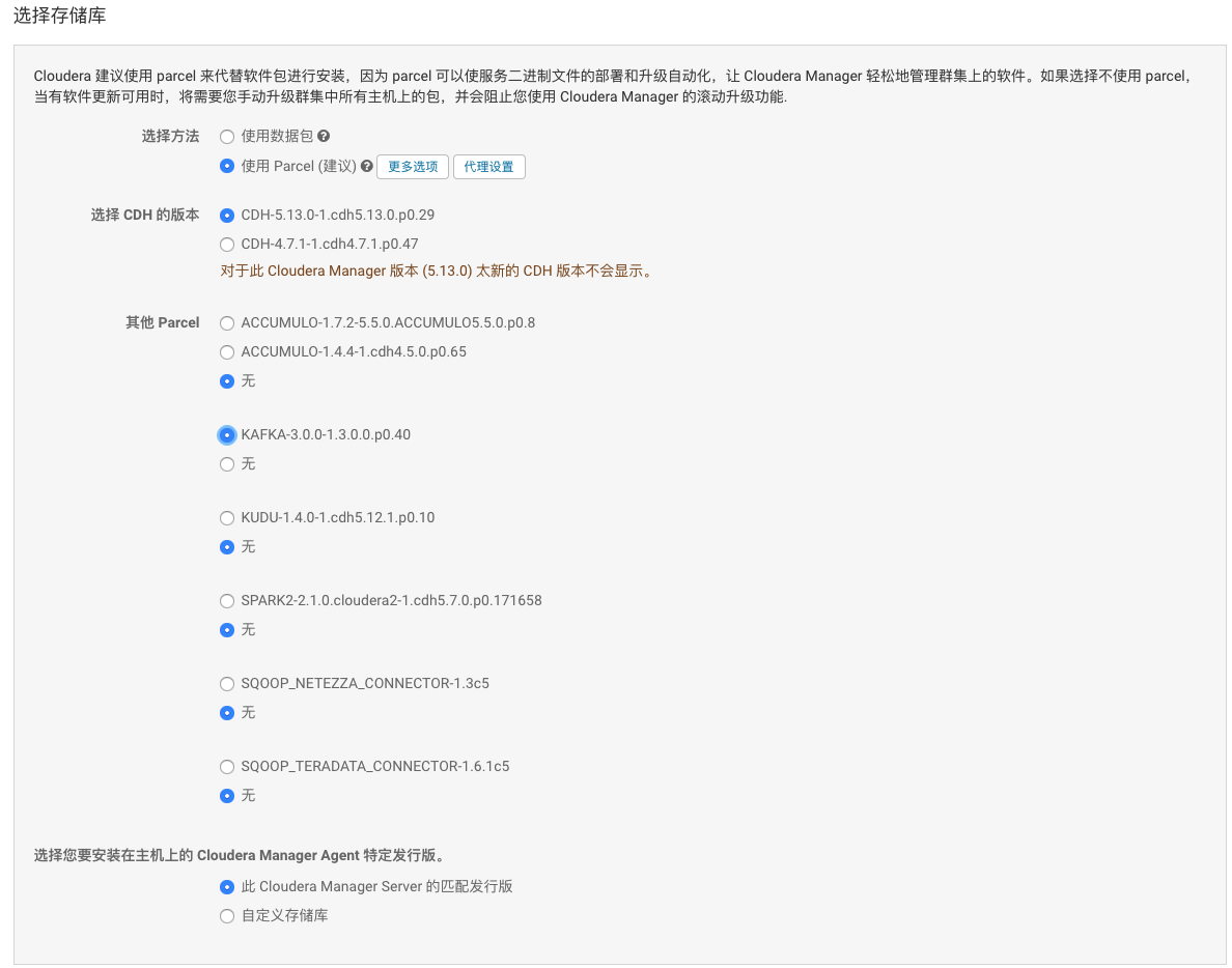 「CDH-5.13.0-1.cdh5.13.0.p0.29」, 请勿选择其他版本,以避免连外网下载比较大的 Parcel 安装包。CDH 如有新版本发布,我们会提供青云相应区的镜像站点的链接,请关注本指南的更新。