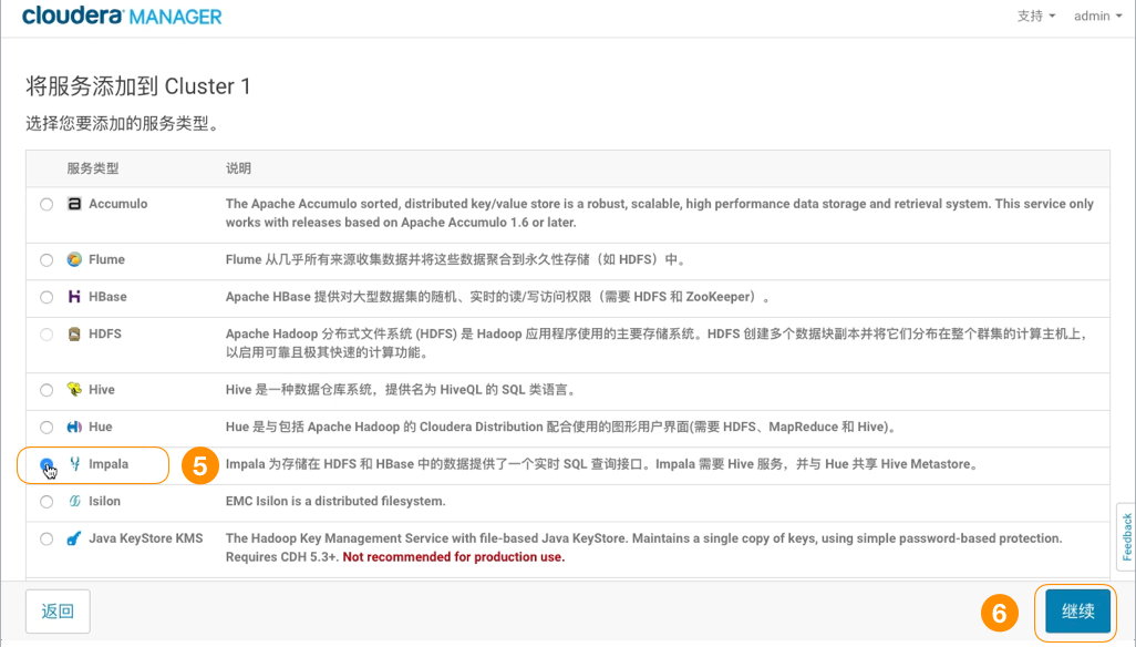 本版本的 CDH(5.13.0)安装包已内置了 Impala 和 Solr ,如有需要可勾选。