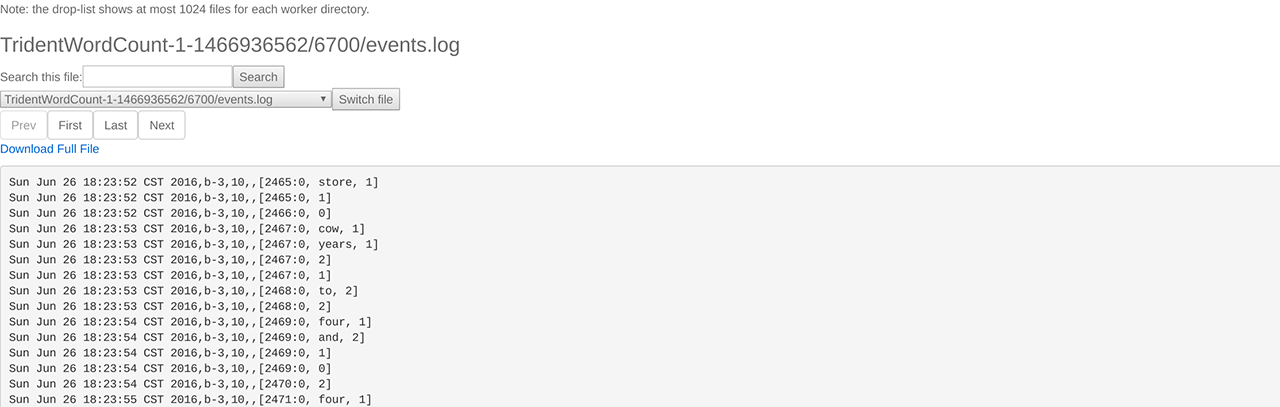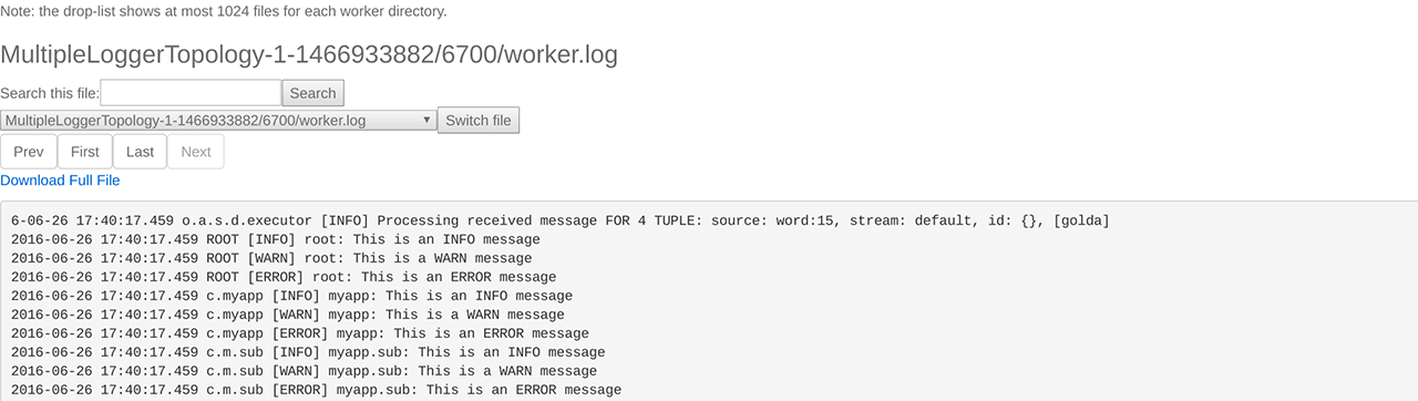 通过 Storm UI 可查看其日志,日志中包含了 INFO、WARN、ERROR 等级别的信息,如下图所示: