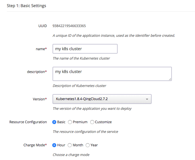 Please go to Kubernetes on QingCloud AppCenter, click ‘Deploy on QingCloud’ button and select specific zone, and input the cluster info such as name, description, version, Two pre-defined resource groups are provided, the basic resource group sets all nodes as high performance type, the prenium group sets all nodes as super high performance type except client node, also you could customize all nodes’ CPU/Memory, how many nodes (nodes count) etc based on your own requirement. Worker Nodes of high performance will be marked with ‘node’ node label, worker nodes of super high performance will be marked with ‘ssd_node’ node label. Our volume plugin will create volume based on master node, so any pod with volume mounted should be scheduled to the worker node which type is same as master node.