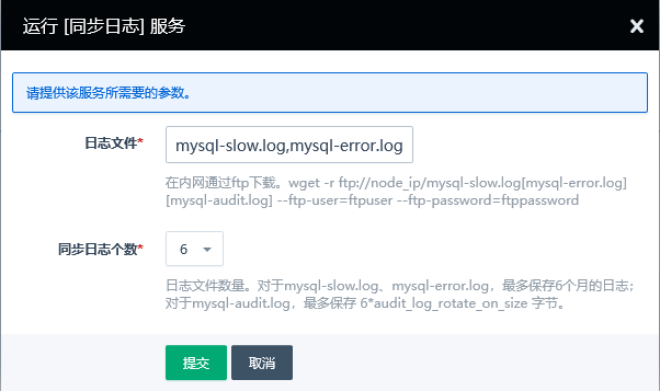 同步日志支持选择同步日志个数(保留六个日志文件),将 mysql-slow.log、mysql-error.log 和 mysql-audit.log 拷贝到系统的FTP目录,可以在内网下载到本地进行分析。