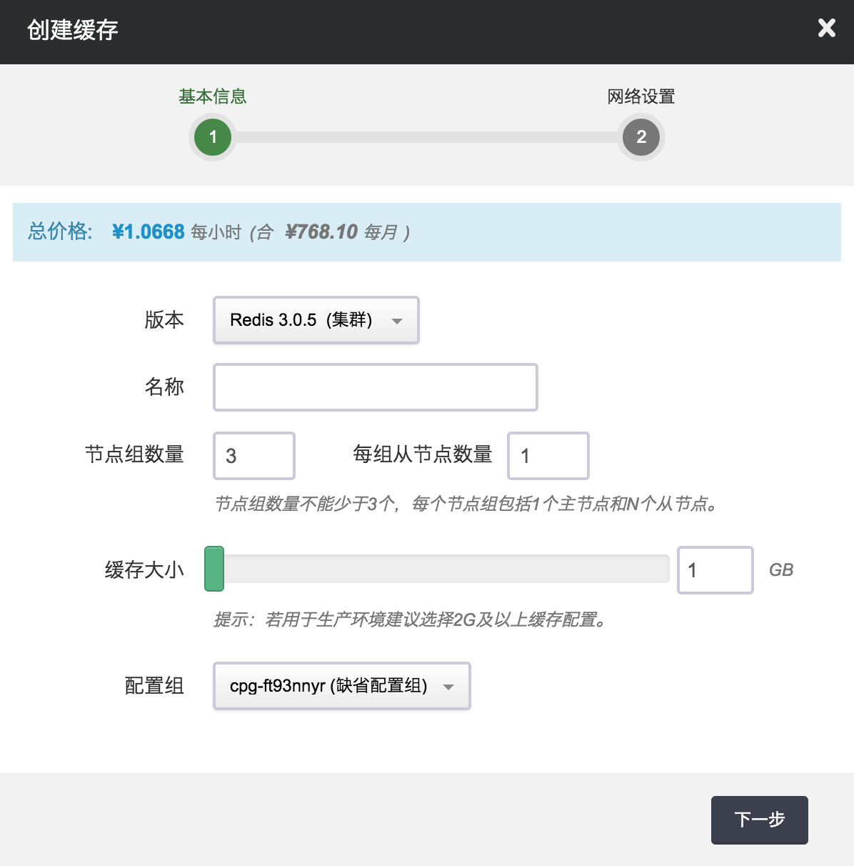 在创建的对话框中,您需要指定缓存服务的类型为 Redis3.0.5(集群)。 每个 Redis 集群服务都会包含至少 3 个节点组, 每个节点组包括 N 个从节点(replicate, 即每个节点组的从节点个数, 可以是 0 个)。 默认情况下,指定 3 个节点组, 每组 1 个从节点,即这个 Redis 集群缓存服务将创建 6 个节点,选择每个节点的缓存大小及配置组,然后点击提交。