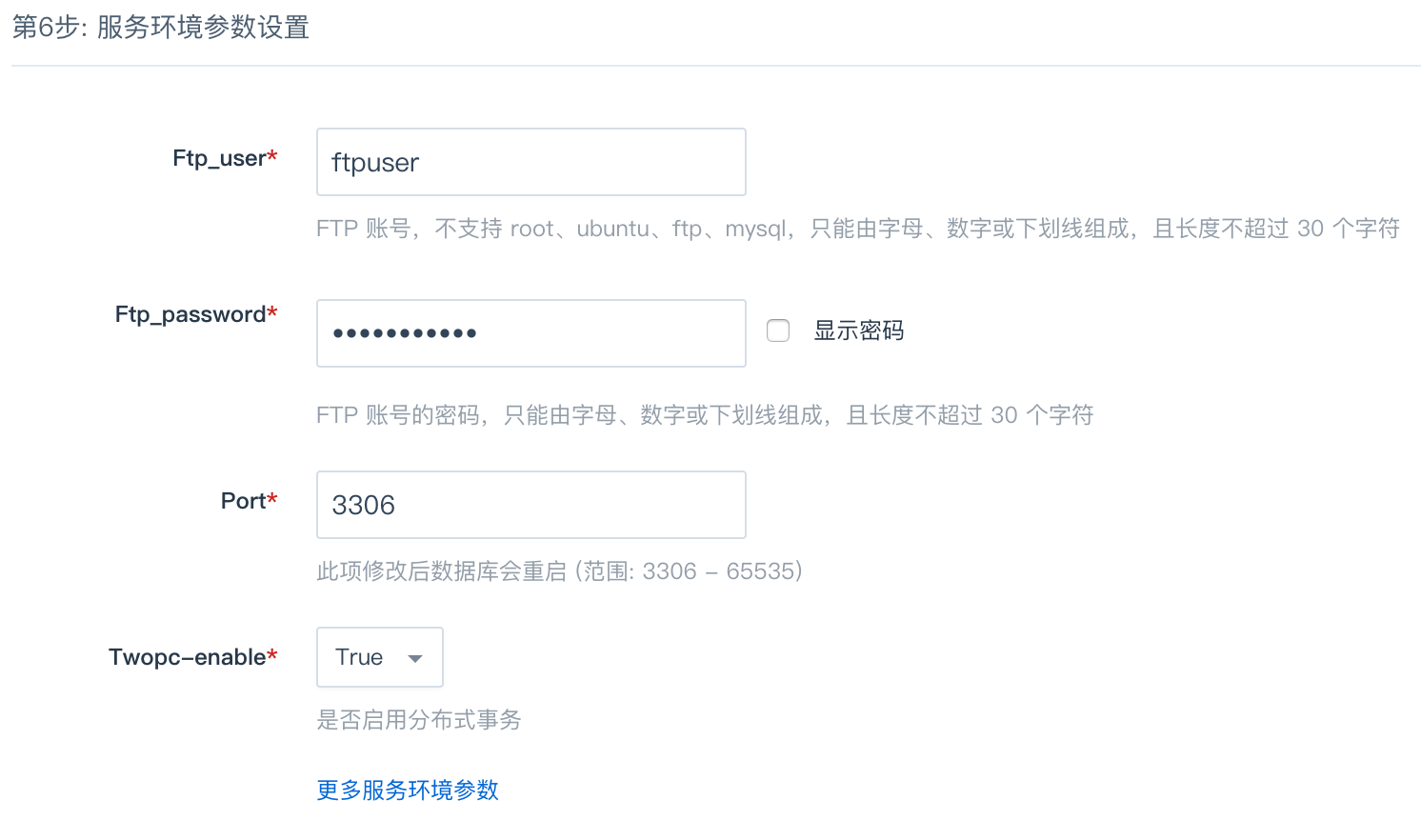 Ftp_user和Ftp_password,点击同步日志后,需使用该账号下载节点上的日志,Ftp_user在集群创建后不支持修改。audit-mode写审计日志的策略,提供None、Audit-Read、Audit-Write和Audit-Read-Write四种策略,默认为NONE,此时不会记录审计日志。twopc-enable分布式事务开关,默认开启。load-balance存储节点读写分离开关。默认开启,读请求会路由到存储节点的高可用读 vip。lower-case-table-names表名大小写敏感开关,默认 0。0 表名将按指定存储,并且区分大小写; 1 表名以小写形式存储,并且不区分大小写。shard-count默认 hash 分表数,可选择 8、16、32、64,默认 16。