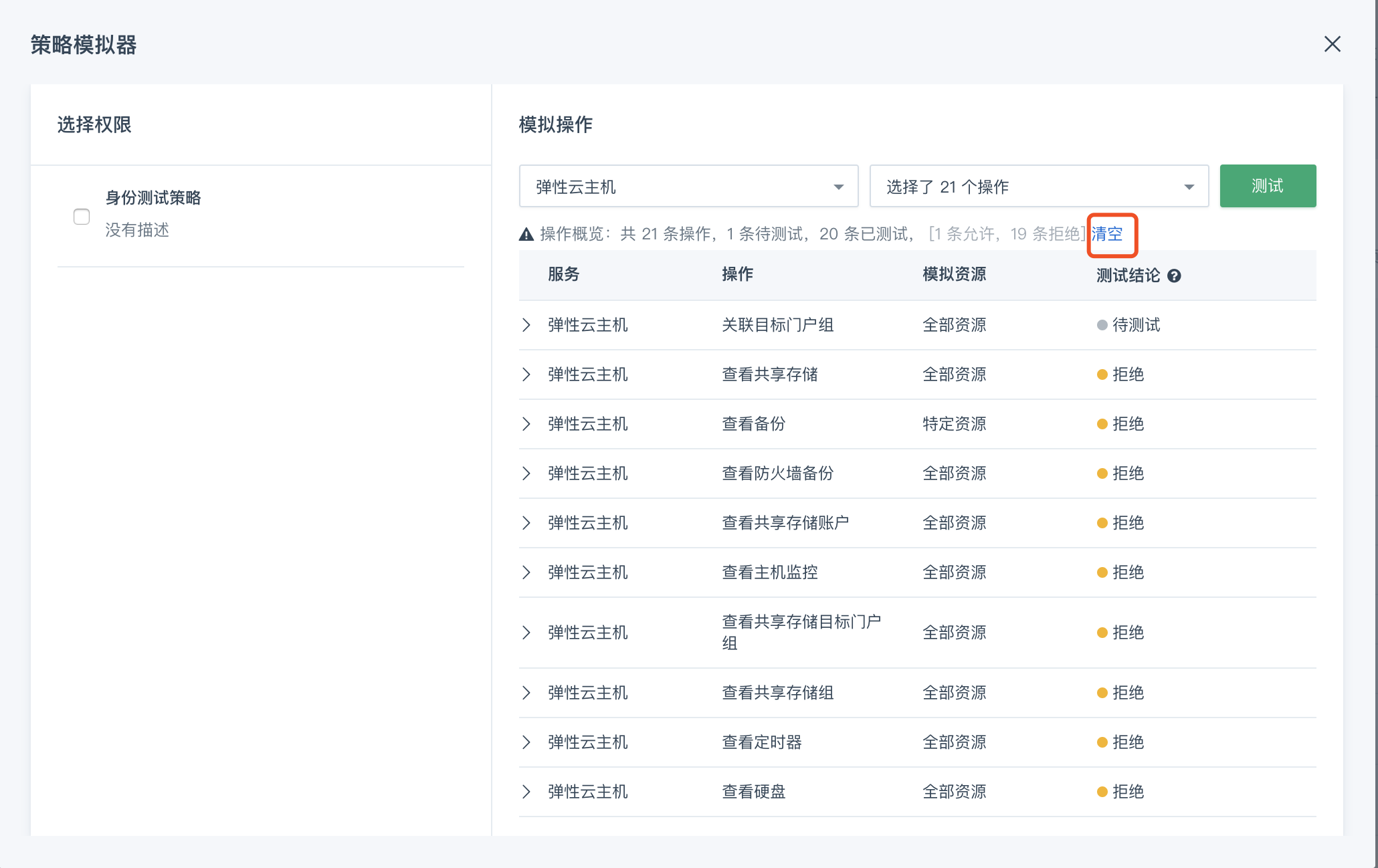 依次选择好(身份和)策略、服务和操作后,点击“测试”即可完成当前复合的策略组合针对已选操作的初步模拟评估。