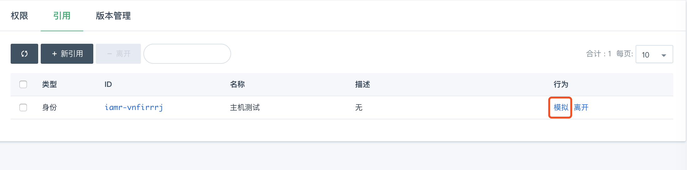 或进入任意策略详情查看策略引用,当存在引用的身份时,列表右侧将提供“模拟”链接: