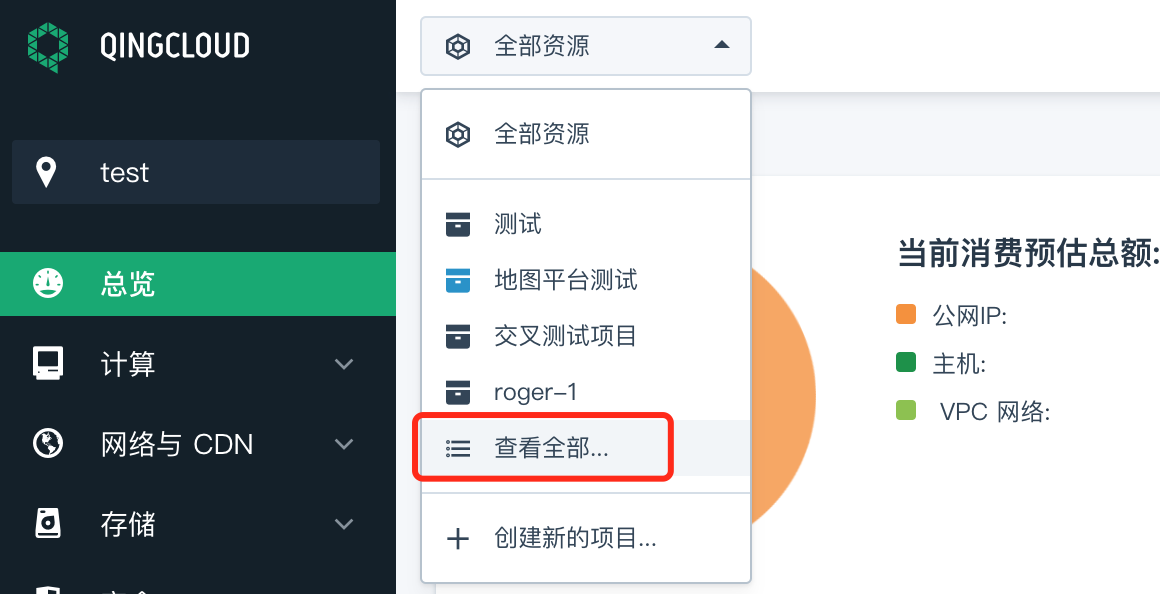 在导航栏顶部点击下拉框的项目名称,或者在全部项目列表中点击项目卡片,即可切换进入项目的总览页。除此之外,您还可以在“全部资源”视图,点击资源列表中的所属项目,直接进入该项目相应资源页面。如:点击主机列表中的项目名称,进入该项目的主机列表页。
