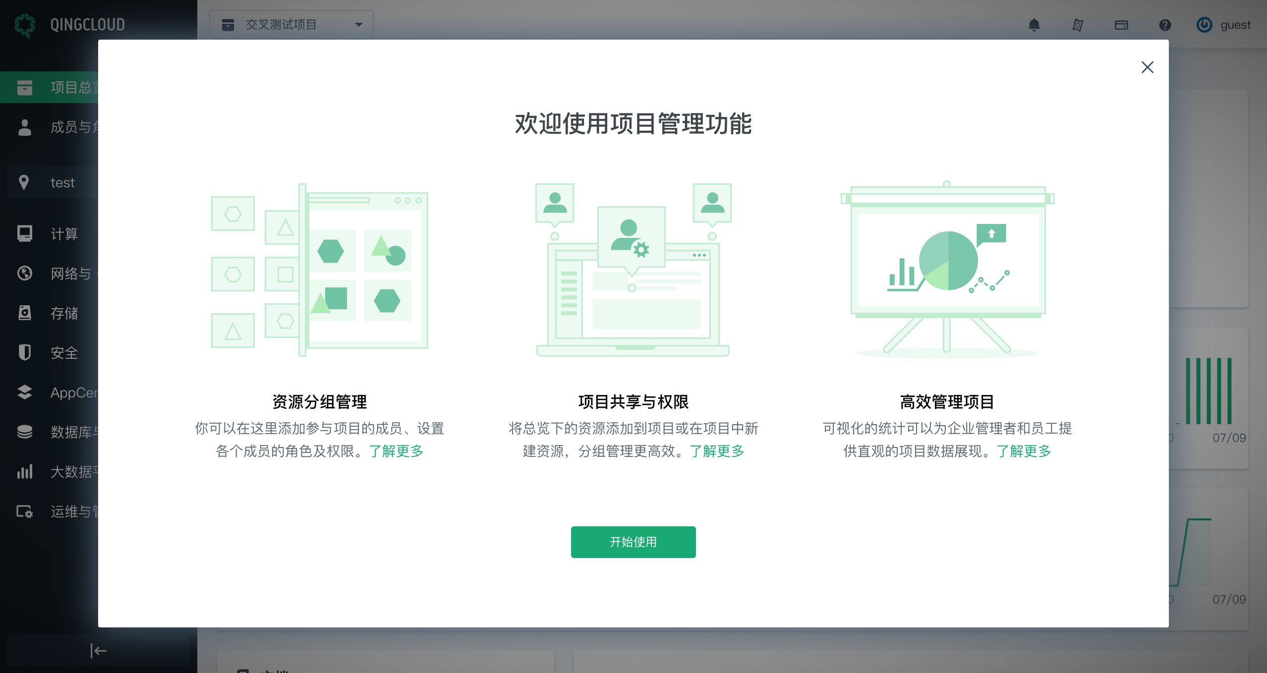 - 基本信息:展示项目名称、ID、描述、成员数量、资源所在的区域、创建时间等信息。