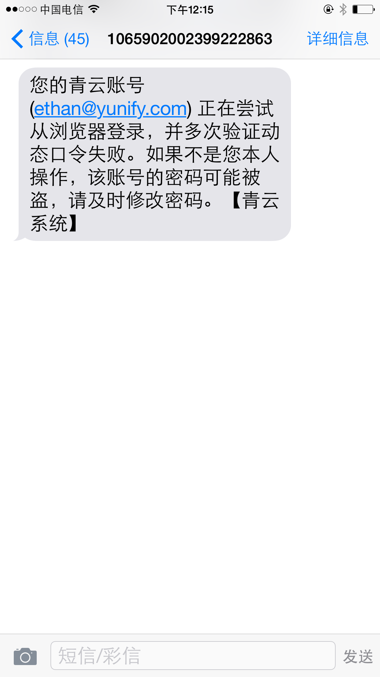 如果您希望有人尝试登录您账号时被提醒,可以开启这个选项。开启后,如果您的账户在密码验证或二次认证失败达到 3 次时,会收到来自青云系统的短信提醒。如果是二次认证多次失败,而且登录者不是您本人或授权使用者,说明您的密码可能已经被窃取,您需要及时修改密码。