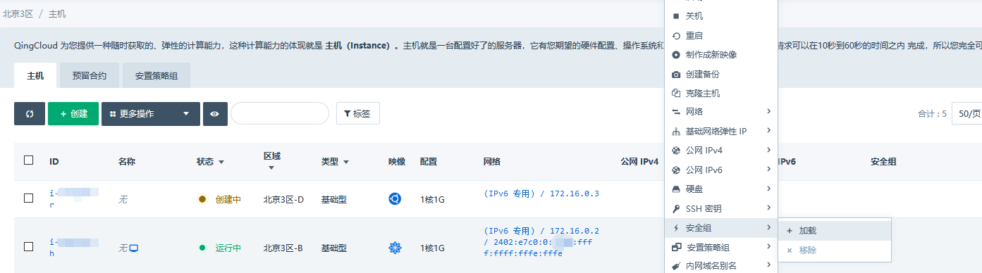 以主机为例,在主机页面,右键主机,点击安全组,可以加载安全组