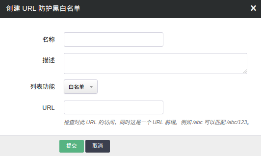除了可以配置自定义的规则,还可以配置自定义的黑白名单以及 CC 防护功能,点击 “黑白名单” 下的 “创建”: