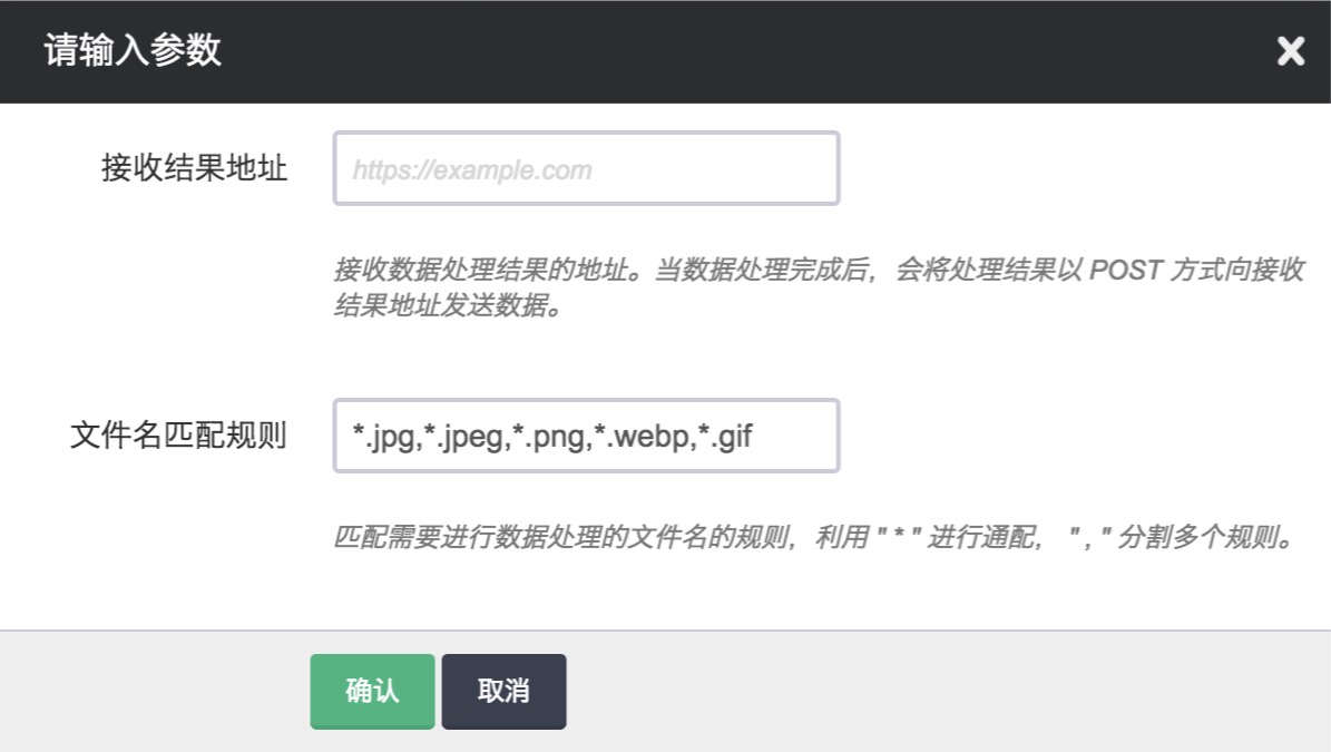 - 接收结果地址:当数据处理完成后,会将处理结果以 HTTP POST 方式向接收结果地址发送数据。